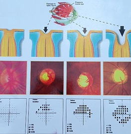 Diagram illustrates progressive optic damage with corresponding visual field loss. Decrease in Visual Acuity (sharpness of image) only occurs in advanced stage. (picture to the right)